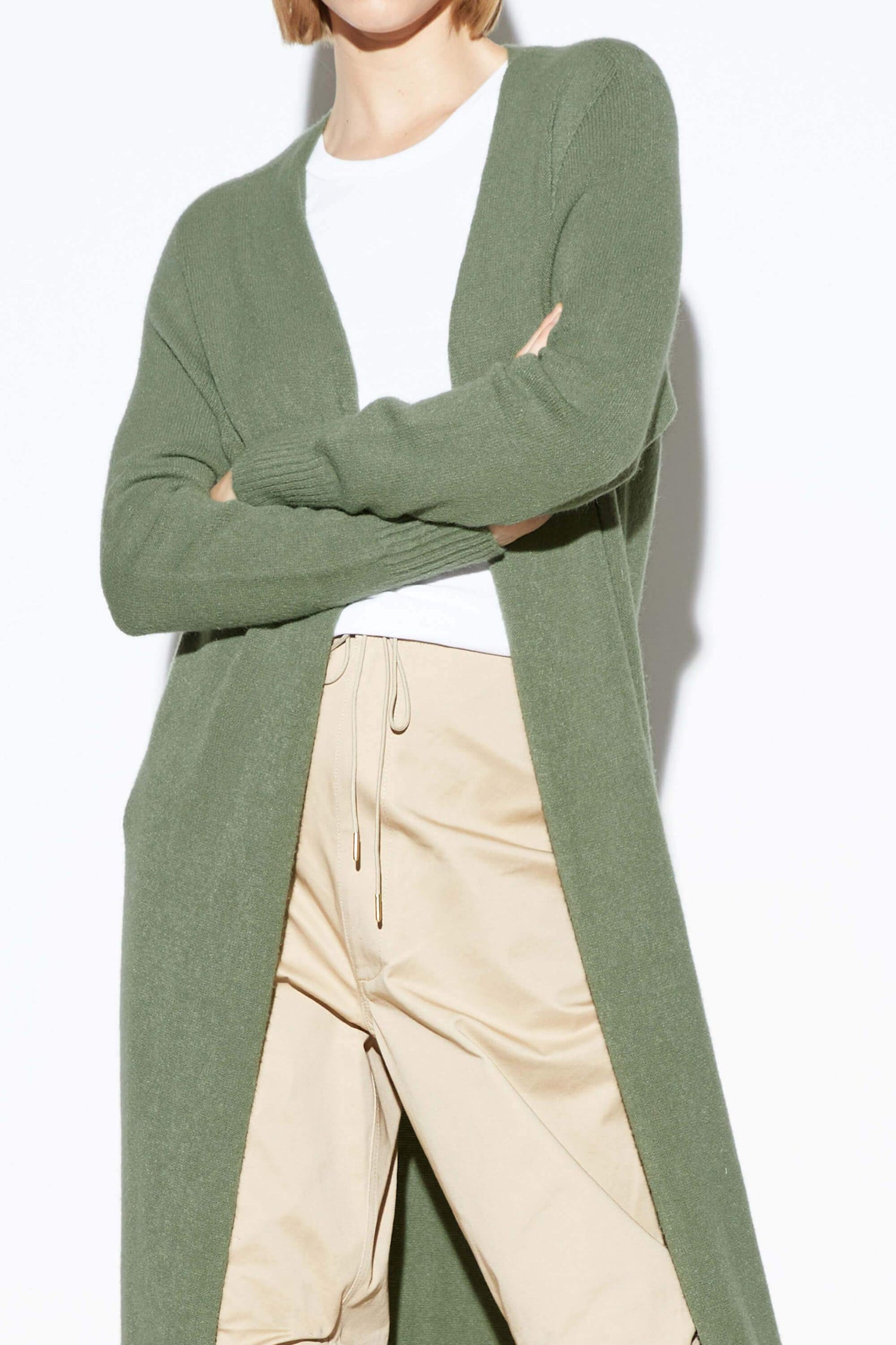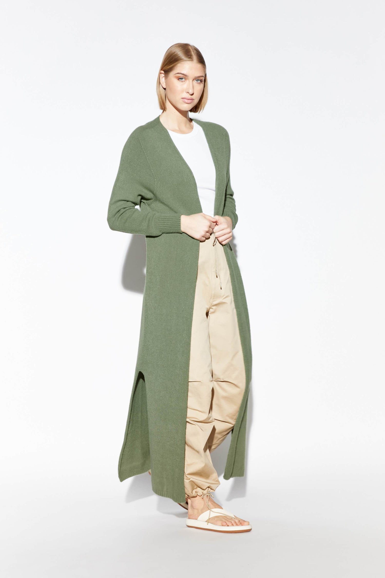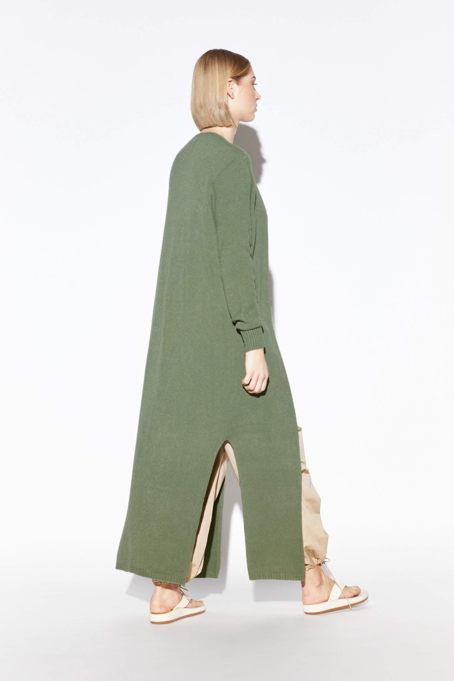 Cruelty-free knitwear. The ultimate layering piece. Open front maxi cardigan with side slits. V-neck collar. Vegan cashmere blend. 50% viscose, 27% Polyester, 23% Polyamide. Low temperature machine wash delicate. Made in Italy.