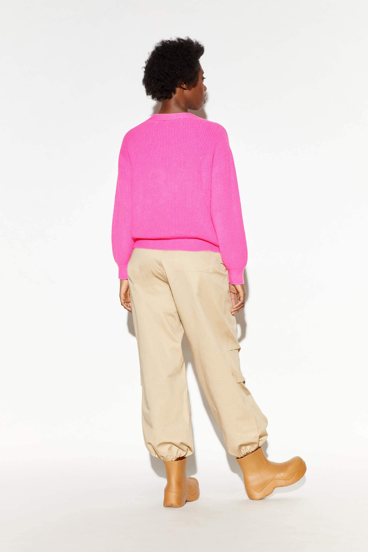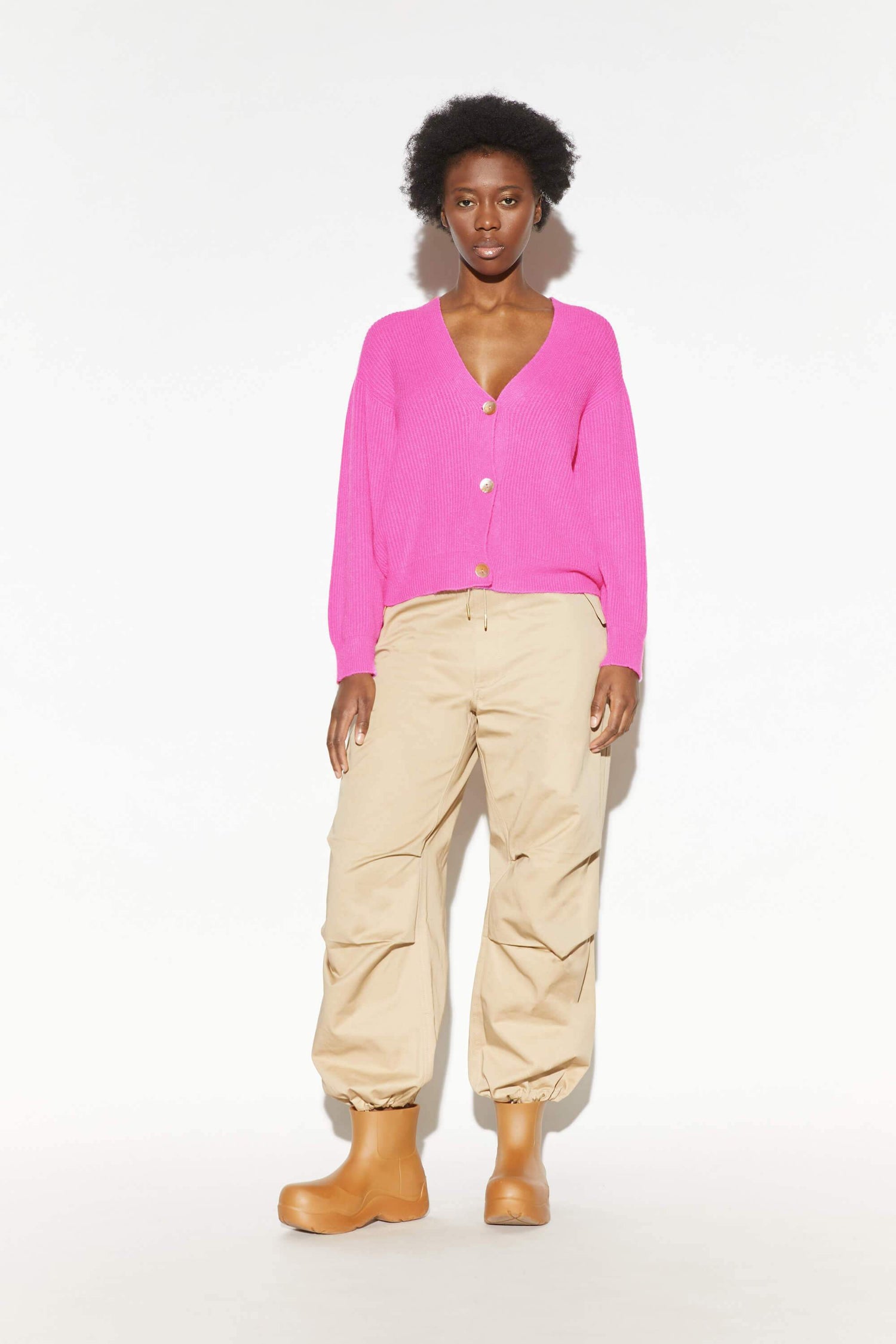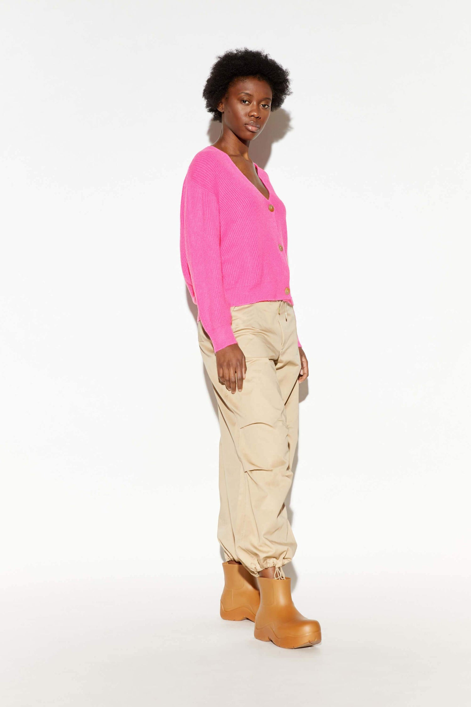 Cruelty-free knitwear. An easy wardrobe win. Ribbed cropped cardigan with unique nacre buttons. V-neck. 50% viscose, 27% Polyester, 23% Nylon. Low temperature machine wash delicate. Made in Italy.