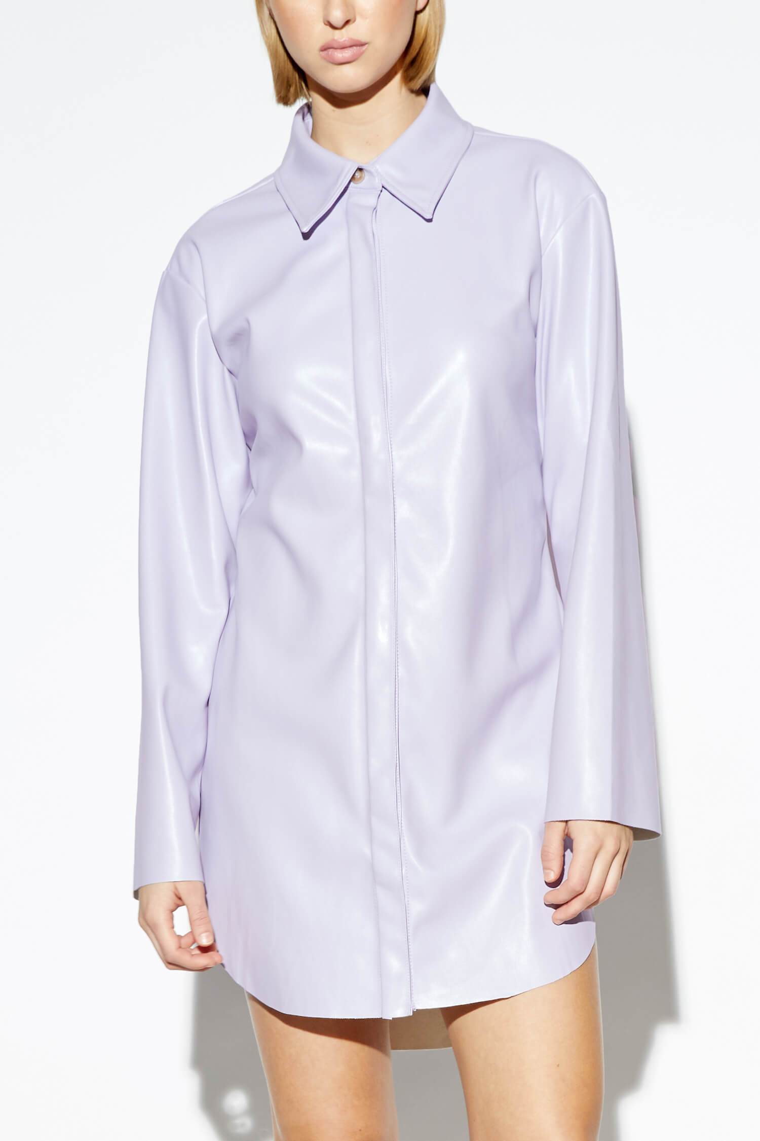 Faux leather shirt dress. Two strap detail at back. Wide sleeve. Two side vents. Concealed button closure. Raw hem. 57% Polyurethane 43% Viscose. Dry clean only. Imported.
