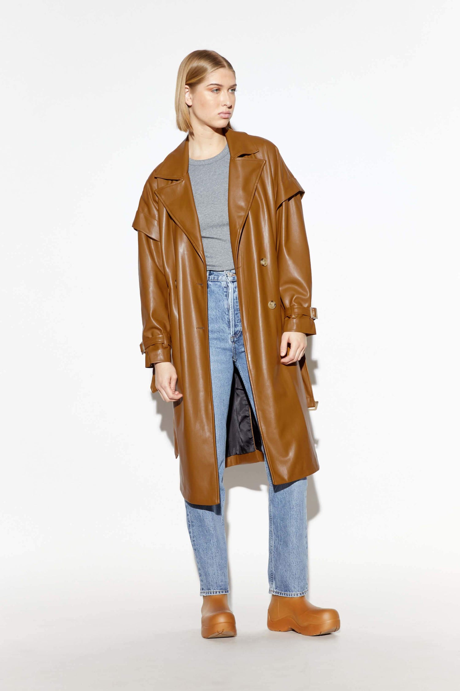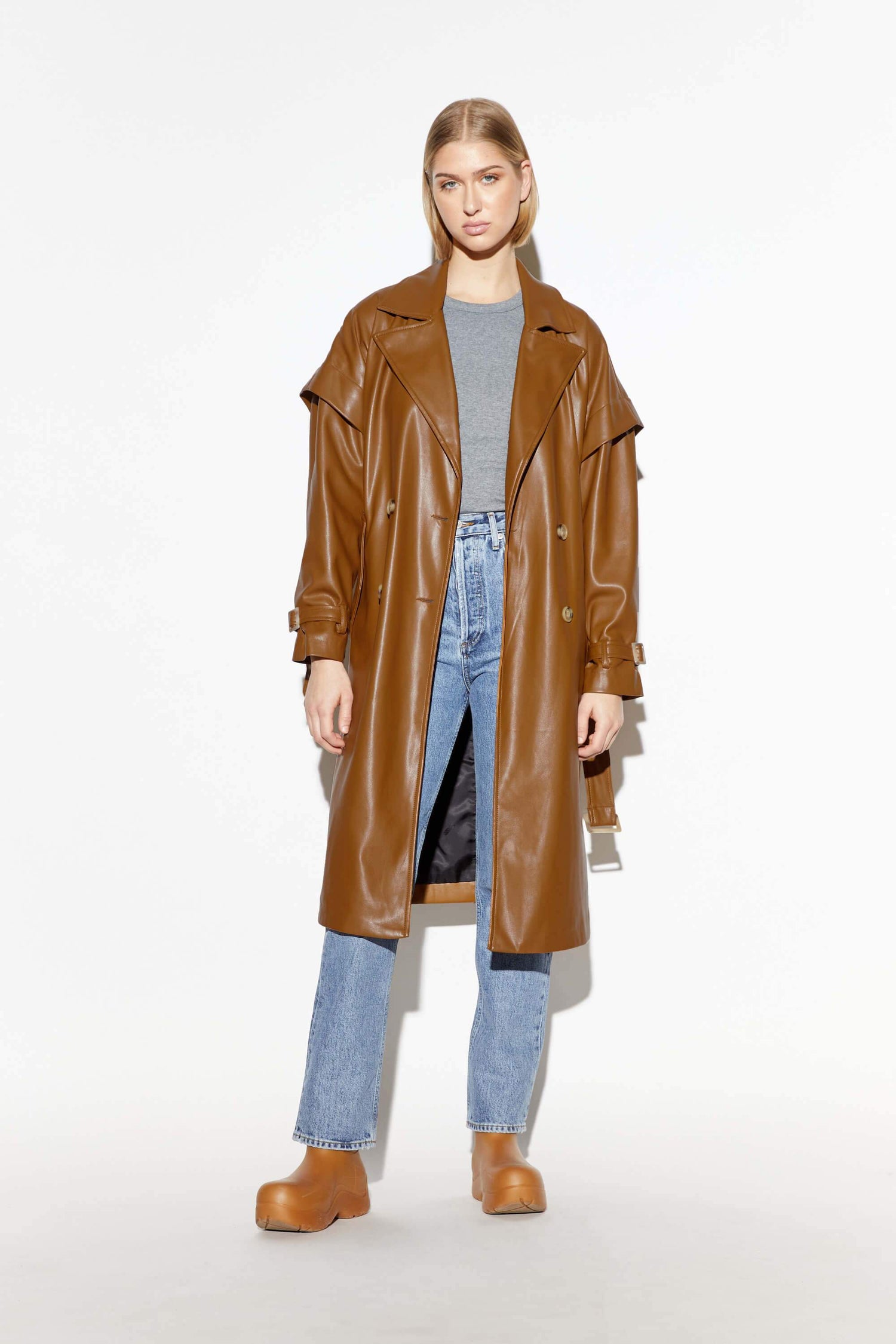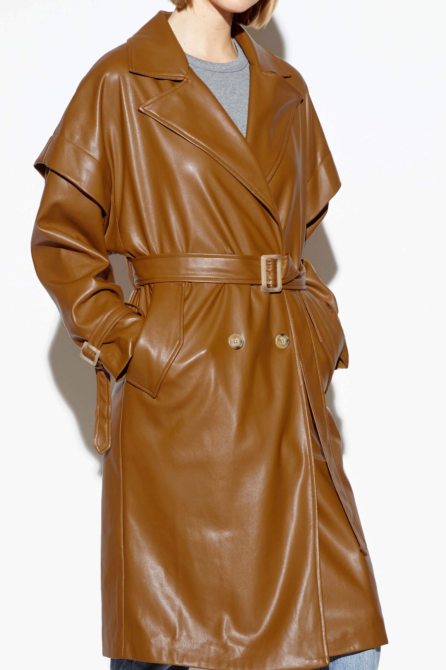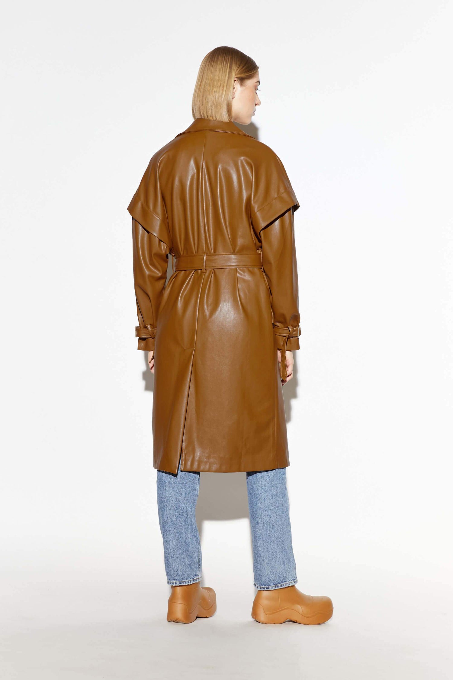 Vegan leather trench coat.