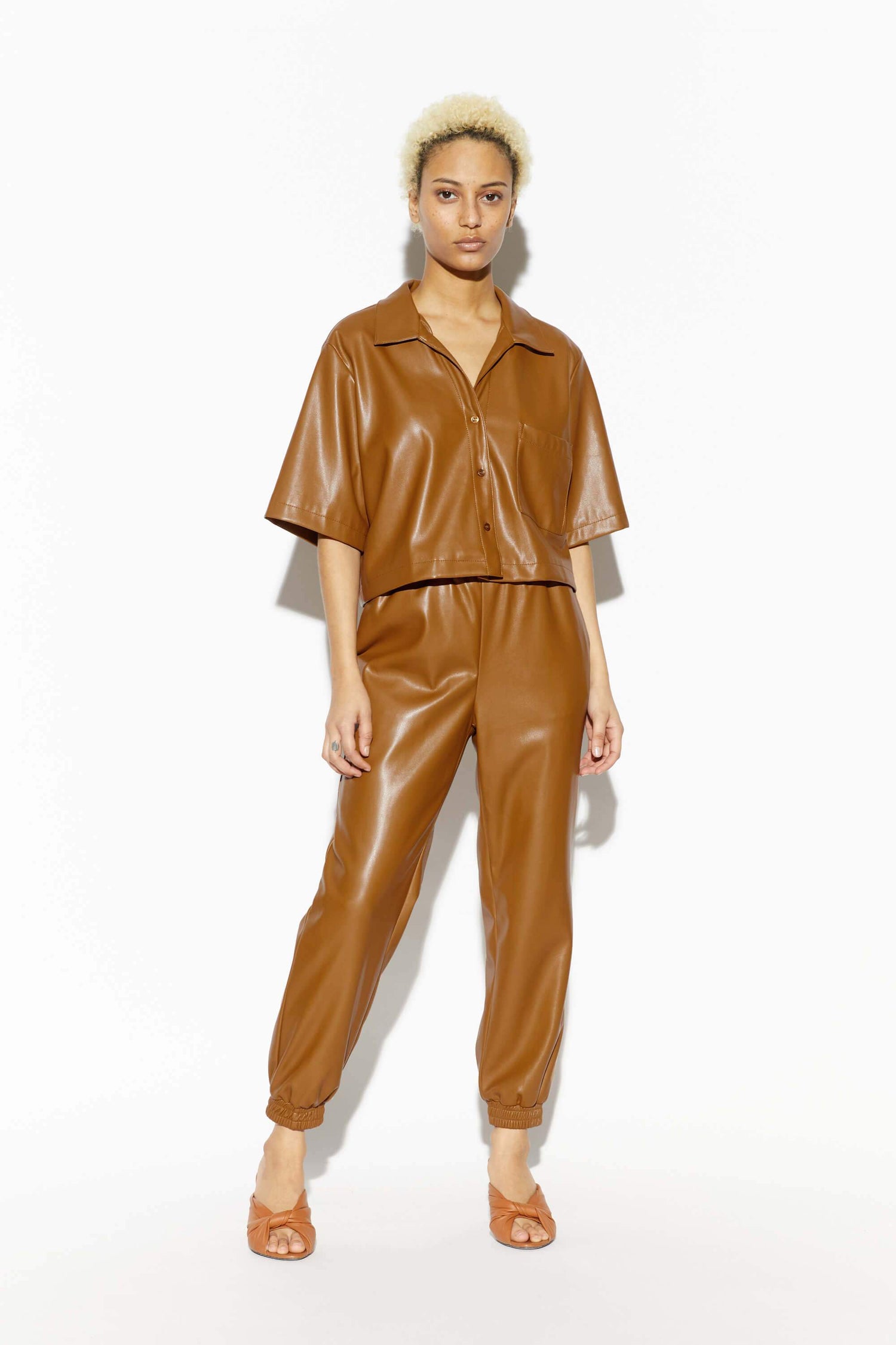 Faux leather joggers. Patch pocket at back. Two side seam pocket. Elastic waist. Elastic cuff at ankle. 57% Polyurethane 43% Viscose. Dry clean only. Imported.