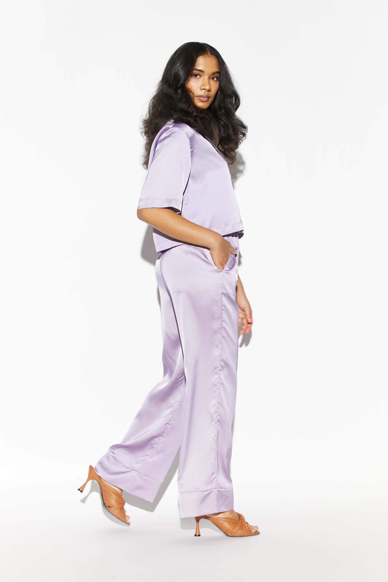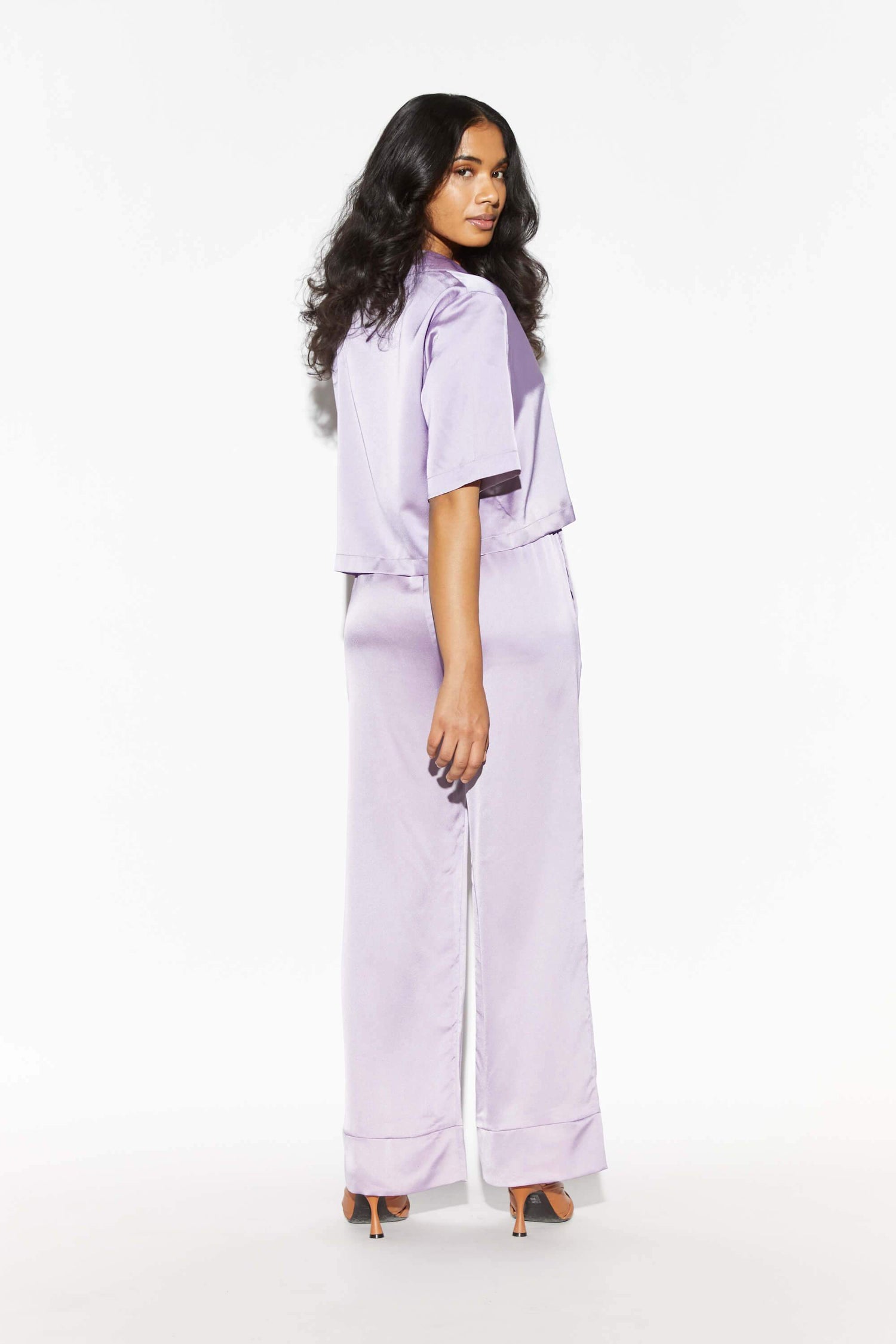 Get extra cozy and pair it with our SANDRA wide leg vegan silk pant in Lilac for a complete look.