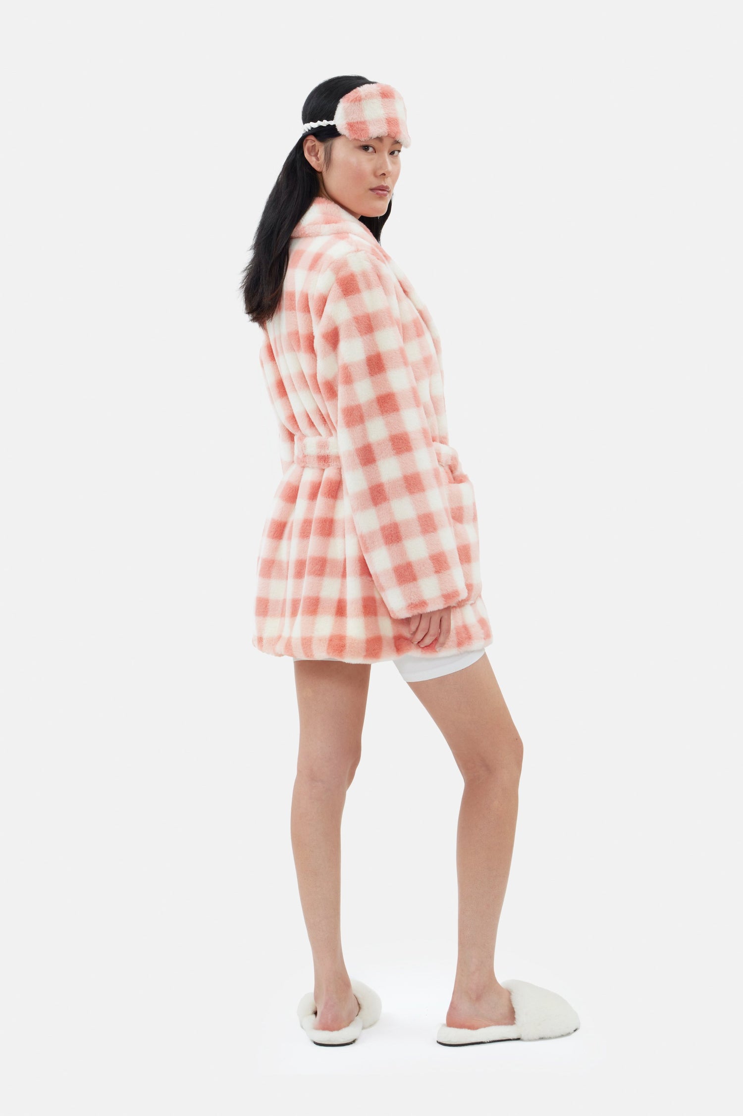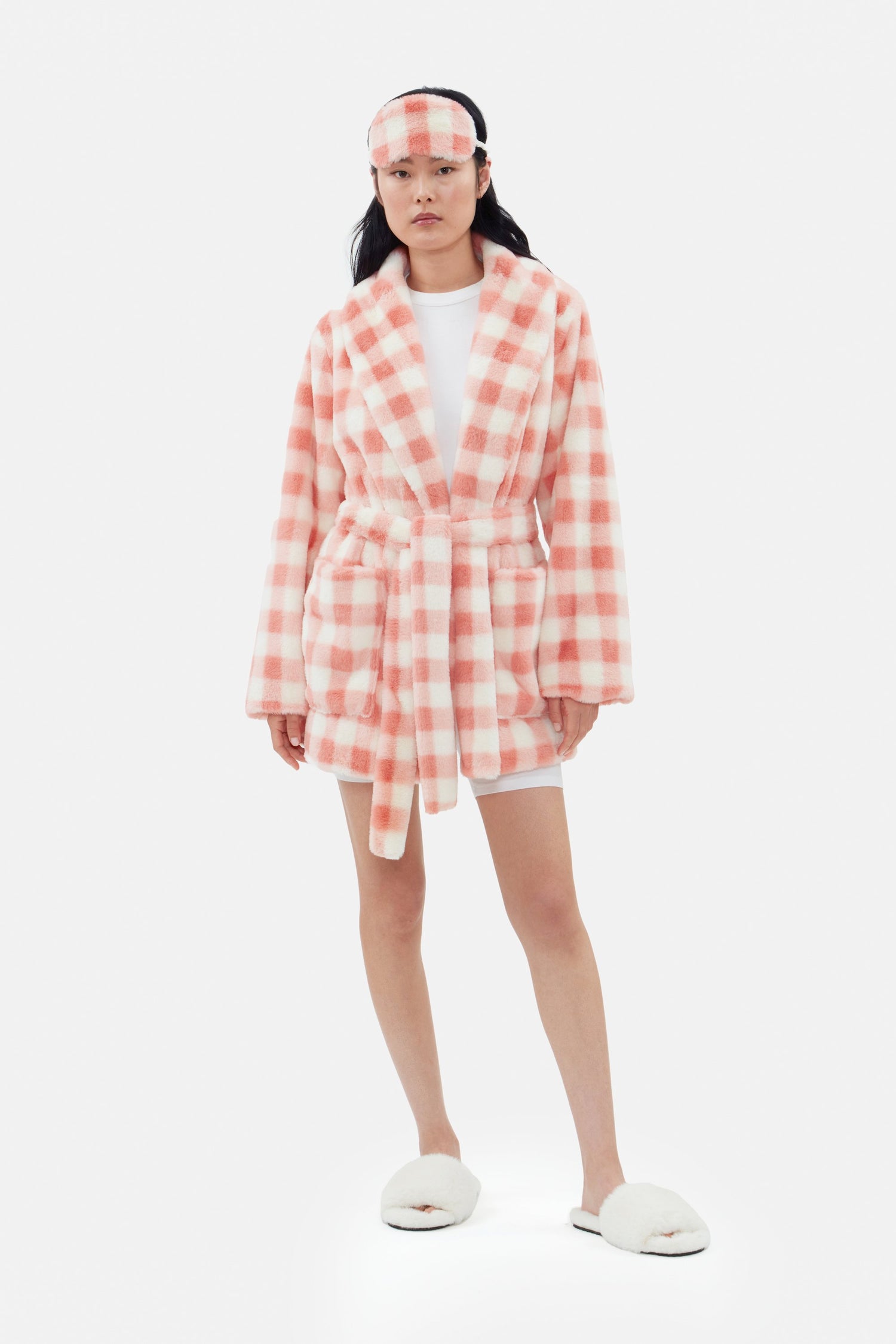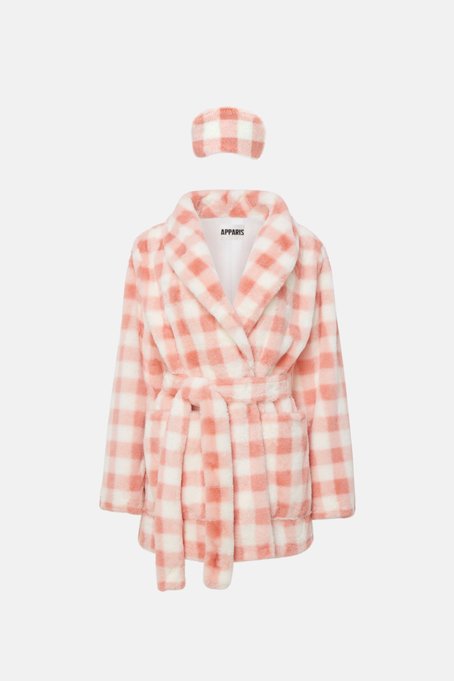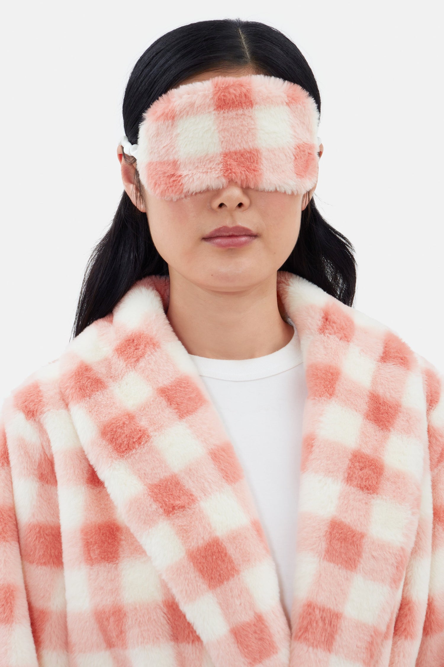 Ultra-soft breathable faux fur mini robe in Gingham print. Belt at waist. Two patch pockets. Hood. Fleece lined. 100% polyester. Dry clean only. Imported. Faux fur eye mask with alternative silk lining and strap. Light-weight and extra soft. 100% polyester. Machine wash cold. Imported.